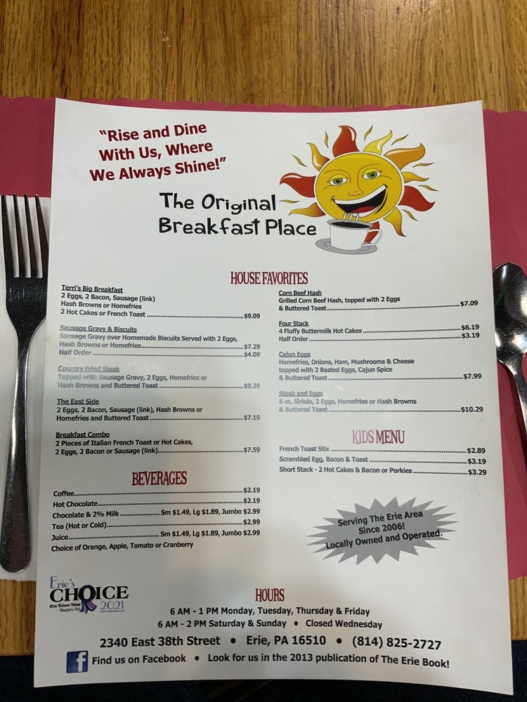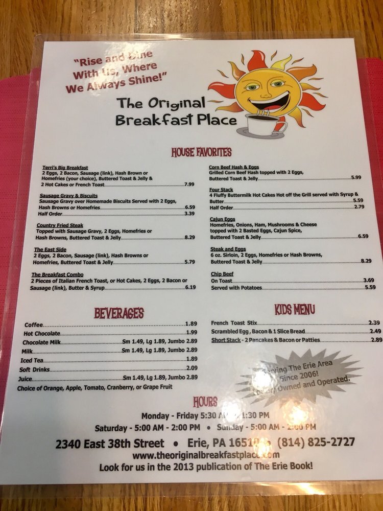 The Original Breakfast Place is a hidden gem located at 2340 E 38th St, Erie, PA. This inviting eatery specializes in breakfast and brunch, serving hearty meals with a side of warmth and friendliness. With an array of vegetarian options and affordable prices, it caters to diverse palates.