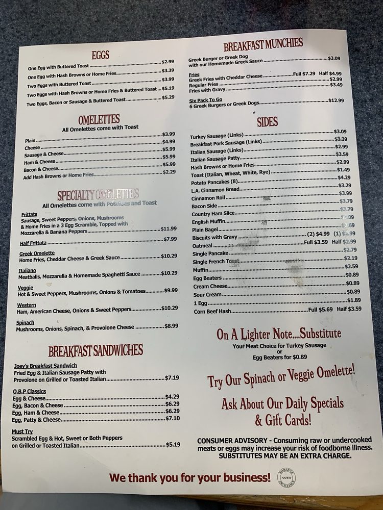 Highlights include the indulgent Joey's Breakfast Sandwich—a delightful combination of fried egg, Italian sausage, and provolone on toasted Italian bread—and their signature Terri's Big Breakfast, which promises satisfaction with home fries and pancakes.